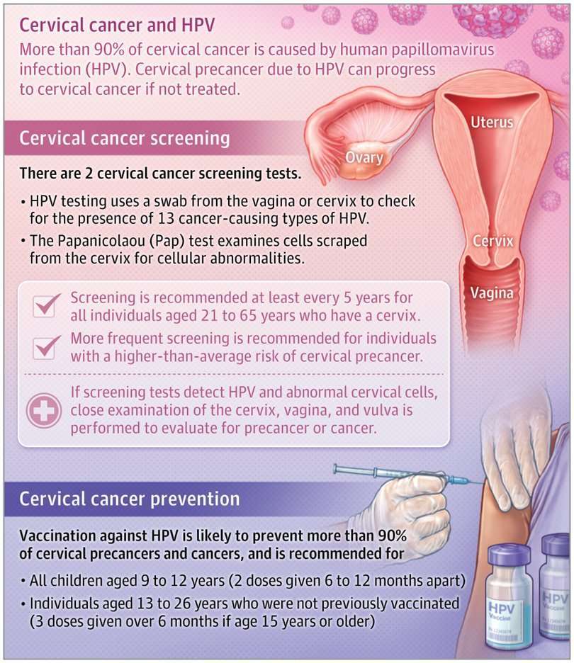 Tarama Önerileri: 21-65 yaş arasındaki bireylerin her 5 yılda bir tarama yaptırmaları önerilmektedir. Rahim ağzı önkanseri riski ortalamanın üzerinde olanlar daha sık tarama yaptırmalıdır. Eğer tarama testleri HPV’yi ve anormal rahim ağzı hücrelerini tespit ederse, önkanseri veya kanseri kontrol etmek için rahim ağzı, vajina ve vulvanın detaylı bir incelemesi gereklidir.